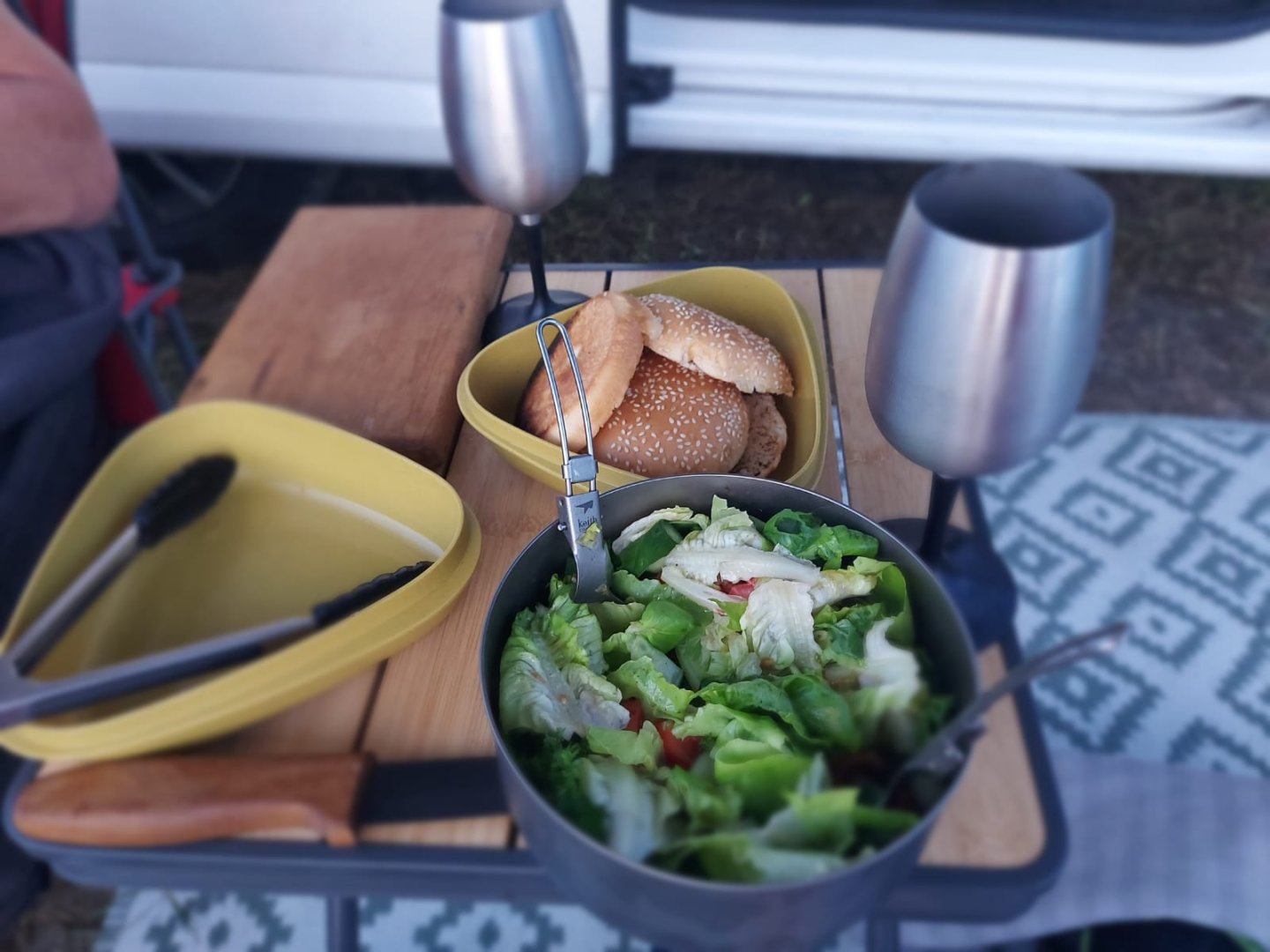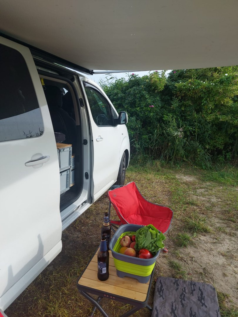 V ceně kempingová výbava, křesla, stůl, kuchyňský box s vařičem a nádobím.